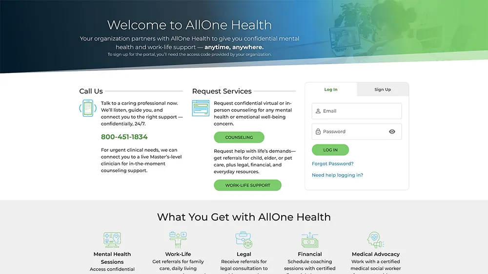 If your organization has partnered with AllOne Health and our family of companies for benefits, you can access services here. Please use the confidential online request forms below, or call 1-800-451-1834.